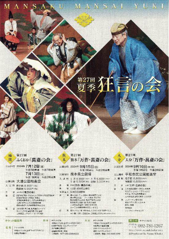 夏季「狂言の会」のお知らせ みなさまお元気にお過ごしでいらっしゃいますでしょうか。 このたびの石川県能登地方を震源とする大地震により犠牲になられた方々に心よりお悔やみ申し上げます。被災されたみなさま、そのご家族のみなさまに心よりお見舞い申し上げます。被災された方々の安全をお祈り申し上げるとともに、一日も早く平穏な日常に戻れますよう心よりお祈り申し上げます。 さて、今年も福岡、熊本、大分にて夏季恒例の狂言の会を開催する運びとなりましたのでお